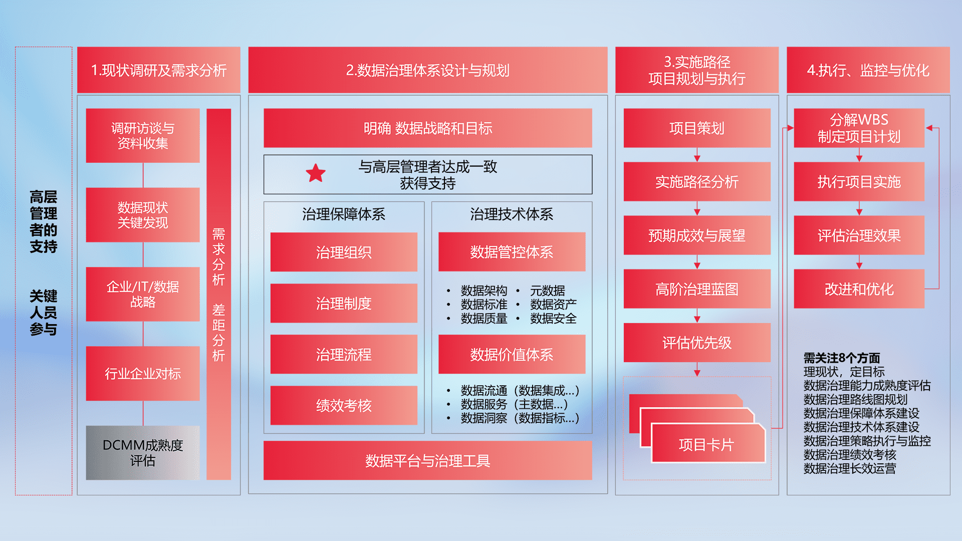 制定并执行统一的数据标准,,,,规范数据定义和格式,,,消除冗余和不一致性,,,实现跨部门和跨系统的数据一致性,,,,为企业提供标准化的数据基础。。。
